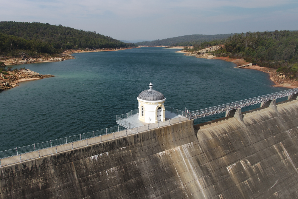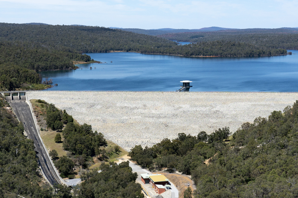 Wungong Dam is located on Wungong Brook approximately 30km south-east of Perth. Constructed between 1975 and 1979, Wungong Dam is a 65m high earth core rockfill dam with a crest length of 460m. The reservoir has a storage capacity of around 60GL at the spillway crest level and is a major water source for the Integrated Water Supply Scheme.